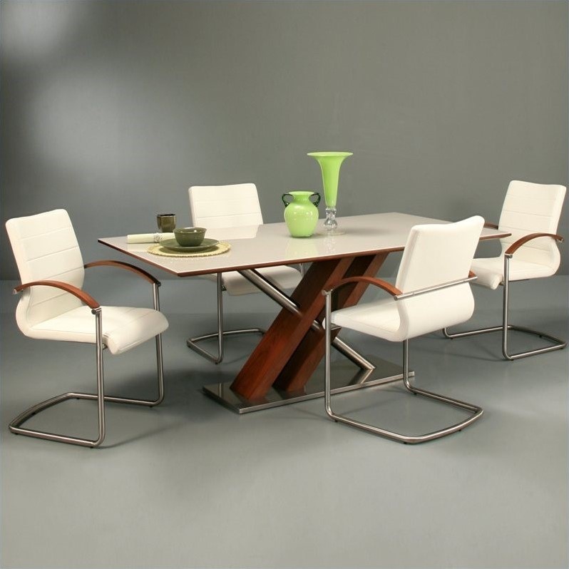 ![]() Pastel Furniture - Dining Sets - CHARLIZE5PAKASHAWAPKG - Pastel Furniture Akasha Arm Dining Chair in Ivory/Walnut VeneerThe Akasha side chair with arm rest reflects a clean and fresh design. With simple lines mixed with curves for comfort, this beautiful chair adds style and elegance to the dining experience. Frame Finish: Stainless Steel, Walnut Veneer; Fabric: PU Ivory; Style: Contemporary; Must purchase in sets of 2. Specifications:Product Dimensions: 36.22“H x 22.83“W x 24.02“D; Weight: 24.2 lbs; 1 year warranty. Pastel Furniture Charlize White Glass Top Dining Table in WalnutThe Charlize rectangular dining table with 70"" x 37"" glass top with clean-lined stainless steel and walnut venner wood frame is a unique yet simple design. This beautifully made table will bring the family together. Table Top: Glass Top; Table Base: Stainless Steel, Walnut Veneer; Style: Contemporary. Specifications:Product Dimensions: 29.53“H x 70.87“W x 37.4“D; Weight: 238.1 lbs; 1 year warranty. Price: 2291.99 |