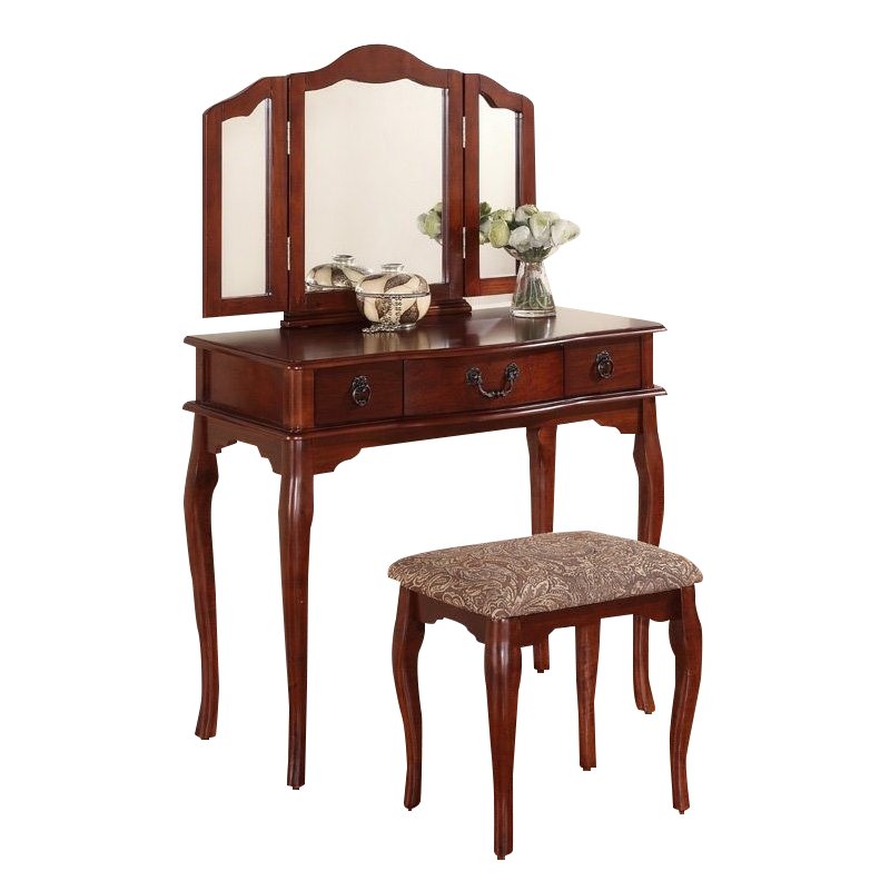 | Poundex Bobkona Susana Mirror Vanity Table with Stool Set in Cherry |