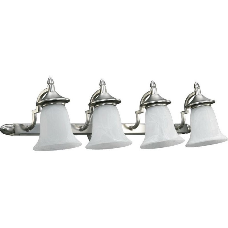 Quorum - Bath & Vanity Lighting - 515465 - Finish: Satin Nickel Number of Lights: 4Light Wattage: 100Socket: MediumShade Color: Faux AlabasterEnergy Star: NUL Type: DampStyle: Transitional