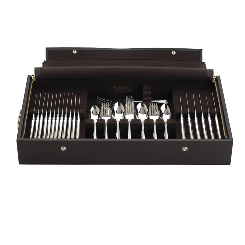 ![]() Reed & Barton - Flatware Storage - 521 - The Arlington Flatware Storage Case by Reed & Barton offers compact, efficient storage of your favorite flatware pieces. Crafted in brown leatherette, it has a cover that opens to a roomy interior with tarnish-resistant brown silver cloth lining. Finish: Brown; Material: Leather; Brown leatherette zippered case ; Includes 2 removable knife trays; Holds up to 36 knives/spreaders; Holds service for 24; Up to 200 pieces. Specifications:Overall Product Dimension: 3.5""H x 11.75""W x 15.75""D; Product Weight: 9 lbs. Price: 125.00 |