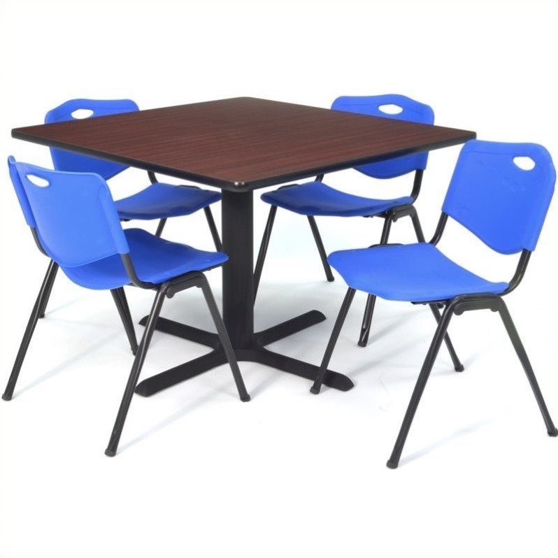 | Regency Square Lunchroom Table and 4 Blue M Stack Chairs in Mahogany |