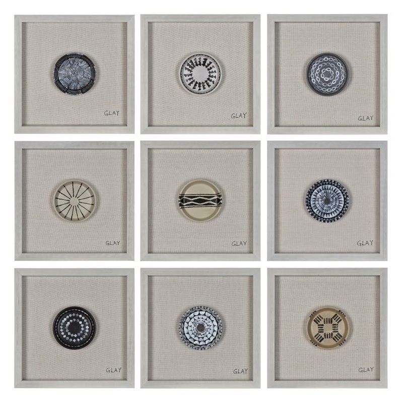 ![]() Renwil - Wall Sculptures - W6314 - Contemporary and crafty, this traditional wall decoration evokes the native beauty of aboriginal pottery. Each clay plate features its own distinctive design in assorted combinations of beige, white, blue and black. The collection is delicately mounted to a linen background for a touch of texture and surrounded by an oak wood frame.Finish: MattMaterial: Clay and WoodArtist: GlayHanging Direction: Horizontal & VerticalSize: SmallHanging Hardware IncludedShape: SquareFrame Color: Off WhiteNine Piece SetSpecifications:Overall Product Dimensions: 16""H X 16""W X 2.1""DOverall Product Weight: 33 lbs Price: 657.99 |