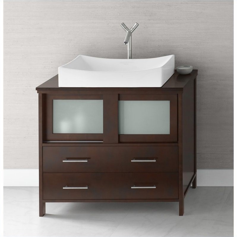 ![]() Ronbow - Bathroom Vanities - 035836H01Kit1 - Offered in a rich cinnamon or luxuriant dark cherry the Minerva is brilliantly designed with frosted glazed sliding doors and full extension drawers. The Minerva brings modern elegance and functionality to all spaces, no matter the size. Solid wood with hardwood plywood construction: NO MDF OR FILLERS; Durable, water resistant polyurthane finish; Matching finish throughout the interior; 2 Full Extension, Soft Close drawers with Dovetail construction; Solid wood drawer front; Frosted glass door front; Quality German all-metal, heavy duty hardware; Free-standing; Pull handles; Faucet not included, Quartz countertop. Set Includes:1 Vanity Base Cabinet; 1 TechStone Vanity Top - 3/4"" Thick; 1 Rectangle Ceramic Sink; 1 Faucet Hole. . Specifications:Overall Product Dimension: 37.76""H x 36.5""W x 19.5""D; Overall Product Weight: 160 lbs. Price: 2091.00 |