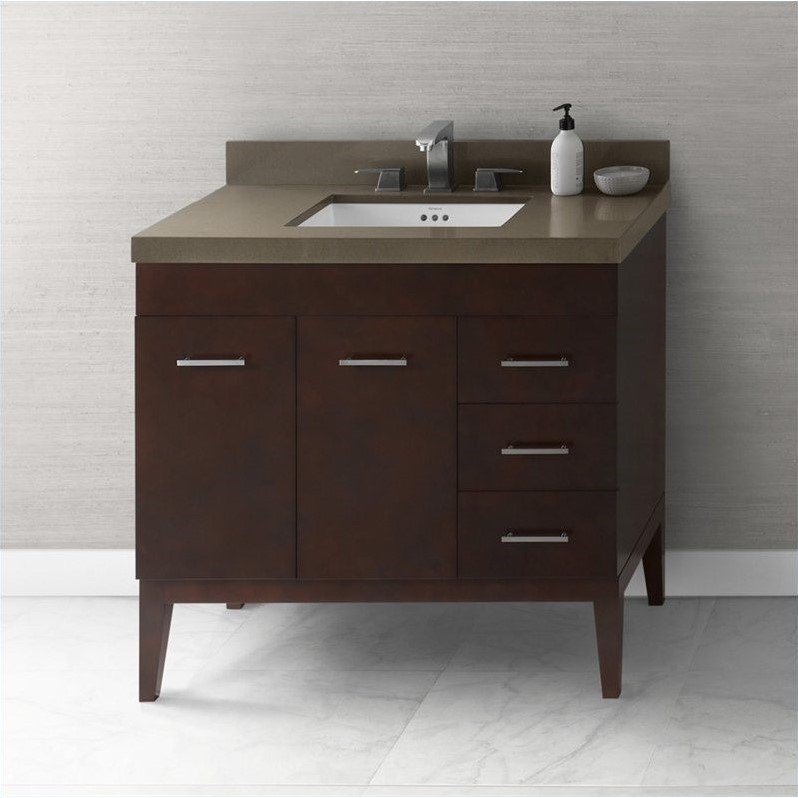 ![]() Ronbow - Bathroom Vanities - 0370367LH01Kit3 - The warm, welcoming tones and sharp lines the Venus exudes are the perfect addition to any space. Available in a cinnamon or dark cherry finish with either wood or metal legs keeps this vanity on point, no matter the trend of the moment. Solid wood with hardwood plywood construction: NO MDF OR FILLERS; Durable, water resistant polyurthane finish; Matching finish throughout the interior; 3 Full Extension, Soft Close drawers with Dovetail construction; 1 Interior Hidden Drawer; Solid wood drawer front; Solid wood door front; 2 Soft-Close doors; Adjustable interior wood shelf; Quartz countertop. Set Includes:1 Vanity Base Cabinet; 1 TechStone WideAppeal Vanity Top - 2"" Thick; 1 TechStone Backsplash; 1 Rectangle Ceramic Undermount Sink; 3 Faucet Hole. . Specifications:Overall Product Dimension: 38.94""H x 36.56""W x 19.69""D; Overall Product Weight: 186 lbs; Overall product dimension includes backsplash. Price: 2555.25 |