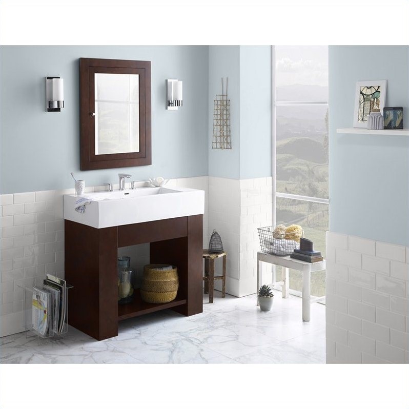 ![]() Ronbow - Bathroom Vanities - 031436H01Kit11 - The open and simplistic design of the Zenia offers versatility, making it the perfect vanity for a wide array of design choices. A detailed dark cherry finish throughout its interior gives the vanity an extra memorable touch. Solid wood with hardwood plywood construction: NO MDF OR FILLERS; Durable, water resistant polyurthane finish; Matching finish throughout the interior; 1 Full Extension, Soft Close drawer with Dovetail construction; Solid wood drawer front; Open shelf; Quality German all-metal, heavy duty hardware; Free-standing; Faucet not included; Ceramic countertop. Set Includes:1 Vanity Base Cabinet; 1 Prominent Ceramic Sinktop with Faucet Hole; 1 Neo-Classic Wood Framed Medicine Cabinet; 3 Faucet Hole. . Specifications:Overall Product Dimension: 37.06""H x 37.63""W x 19.69""D; Overall Product Weight: 192 lbs. Price: 2160.00 |